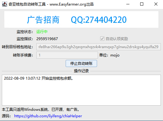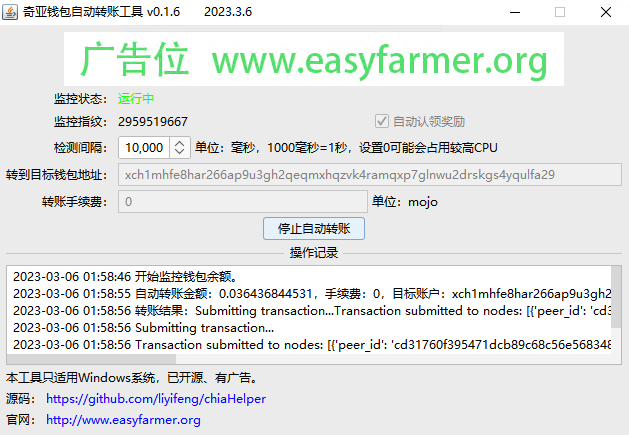 用了两天时间写了个奇亚钱包自动转账的工具,每隔10秒钟查询一次奇亚钱包余额,发现有xch立即自动转账到指定账户。