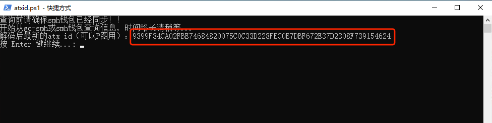 Write-Host "查询前请确保smh钱包已经同步!!" Write-Host "开始从go-smh或smh钱包查询信息,时间略长请稍等..." # 执行命令并将输出存储到 $result 变量中 $result = .\grpcurl -plaintext 127.0.0.1:9092 spacemesh.v1.ActivationService.Highest # 将输出的 JSON 字符串转换为 PowerShell 对象 $jsonObject = $result | ConvertFrom-Json # 访问所需的属性值 $highestActivation = $jsonObject.atx.id.id # 输出属性值 # Write-Host "解码前:Highest Activation ID(注意这不是P图用的): $highestActivation" $bytes = [Convert]::FromBase64String($highestActivation) $hexString = [BitConverter]::ToString($bytes) -replace '-' $output = "解码后最新的atx id(可以P图用):$hexString" Write-Host $output pause