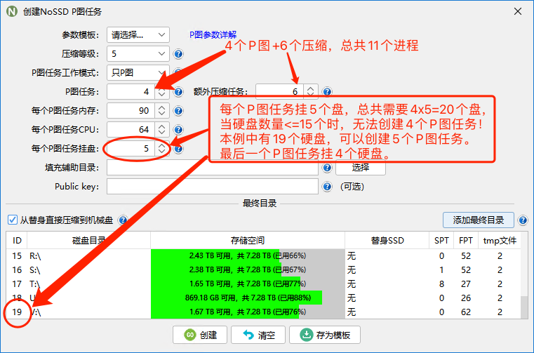 能开4个P图任务的前提是要有足够多的机械盘,【每个P图任务挂盘】5个,最多需要20个盘,最少需要16个,硬盘<=15只会创建3个P图任务,此例子中每个任务的挂盘数就是:5、5、5、4。