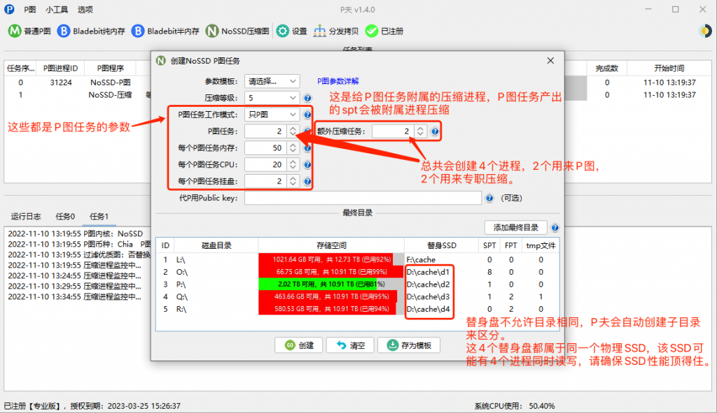 单个P图任务写入速度大概270+MB/s,压缩任务可能有130+MB/s,可以将一个SSD分配给多个机械盘当替身,建议普通sata接口的SSD不要给超过2个任务做替身,m2或者企业固态请根据SSD读写能力自行决定数量。