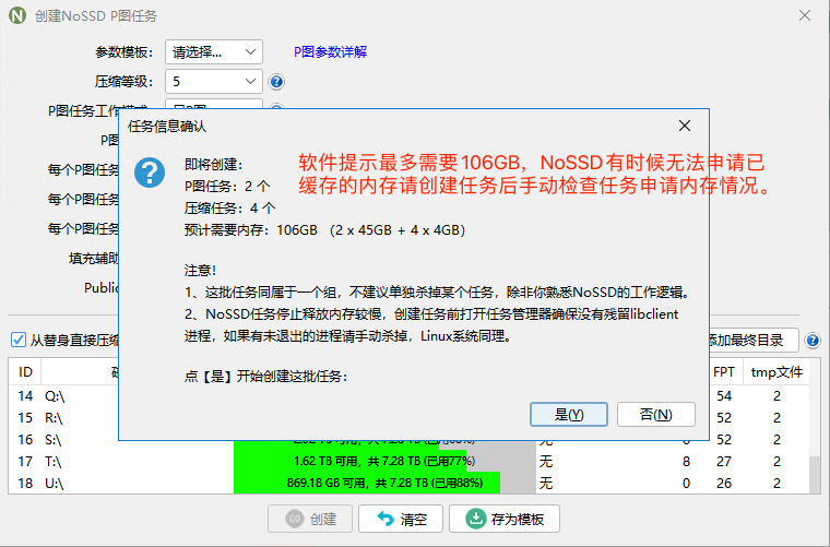 下图是创建NoSSD的任务界面,左侧红框中全部都是针对P图进程(根据模式决定,不一定只P图)任务的参数,右侧红框【额外压缩任务】进程没有那么多自定义参数。