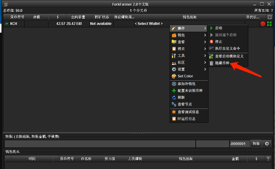 界面上可能会显示已识别到的奇亚程序,可以右键-【操作】-【隐藏币种】将它隐藏,因为它识别到的是官方程序不是我们需要的。