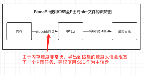 对于Bladebit强烈建议设置SSD中转盘,因为前一个图P完从内存导出到磁盘的时间过长会阻塞下一P图任务。
