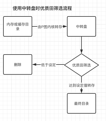 需要说明的是如果使用中转盘,筛选过程是在图进入中转盘后进行,通过则转存到最终目录,否则直接删除。如果未使用中转盘,会等到该图存入最终目录后进行筛选,不合格依然会从最终目录删除。