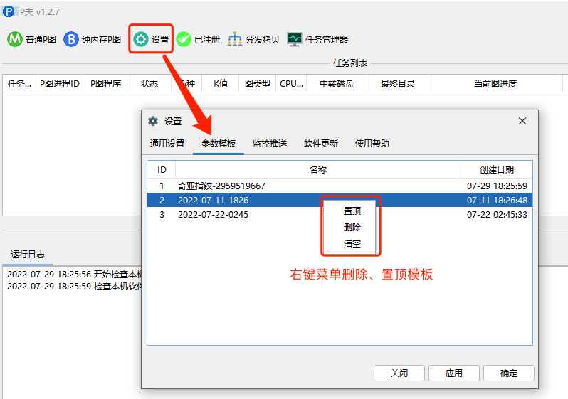 模板删除、置顶功能在【设置】—【参数模板】页面。