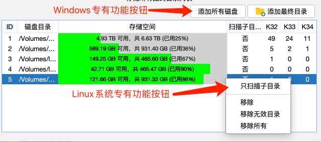 【添加所有磁盘】和【只扫描子目录】的功能目的都是想提前设置好监控范围,对于未来可能出现新机械盘的位置进行监控,一旦插入(或挂载)了新硬盘不用操作软件自动将其P满。